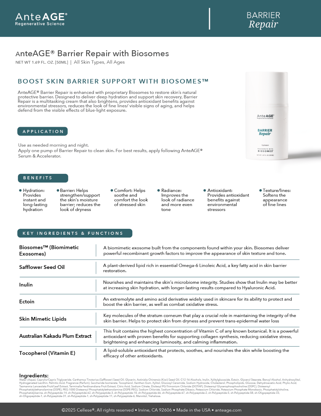 AnteAGE® Barrier Repair is enhanced with proprietary Biosomes to restore skin's natural protective barrier. Designed to deliver deep hydration and support skin recovery, Barrier Repair is a multitasking create that also brightens, provides antioxidant benefits against environmental stressors, reduces the look of fine lines / visible signs of aging, and helps defend from the visible effects of blue-light exposure.
