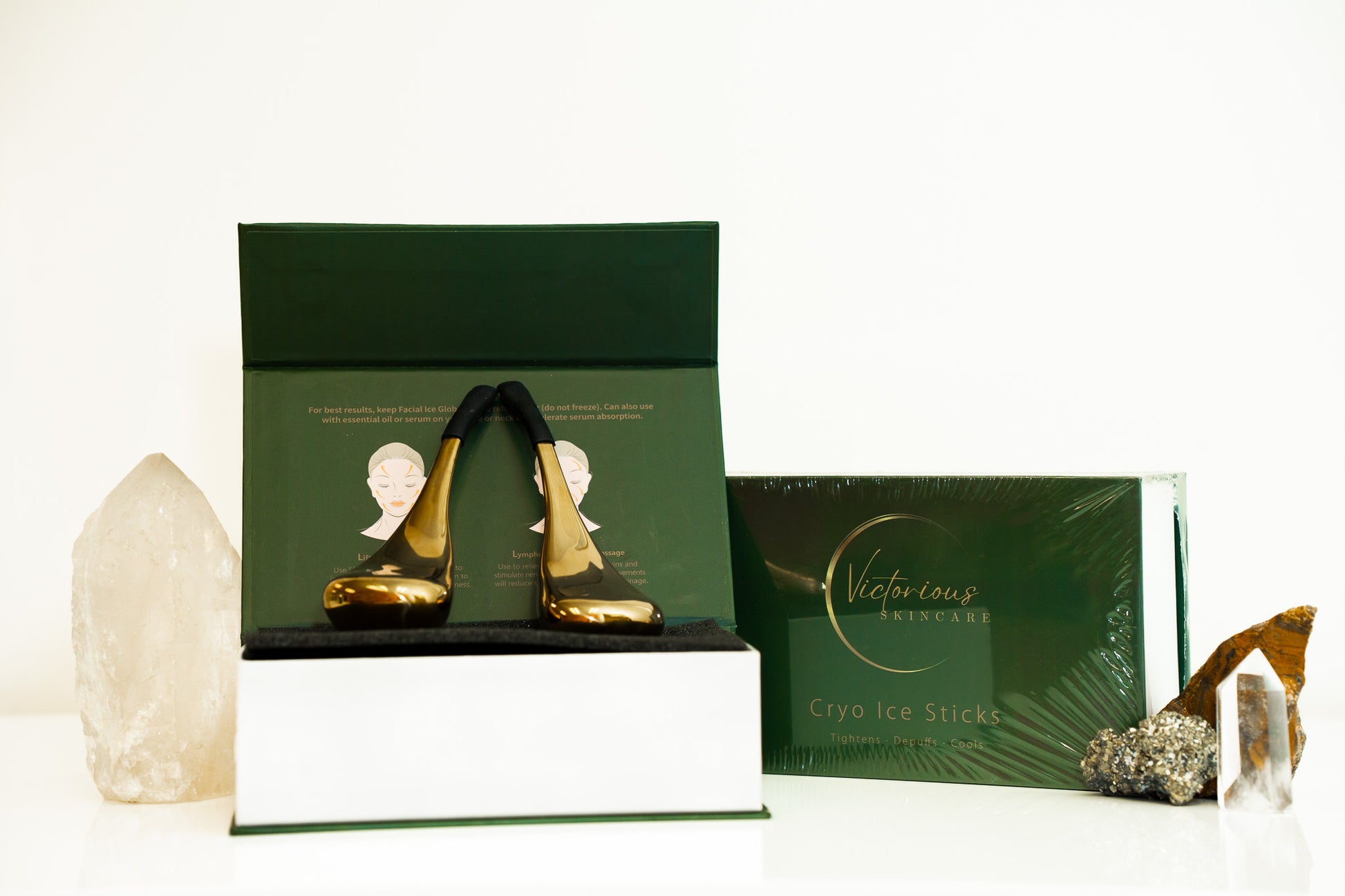 Introducing a gold cryo facial set that harnesses the power of cold temperatures by increasing blood flow to provide an invigorating facial experience in the comfort of your own home. Use with your favorite face serum, oil, or over a sheet mask!